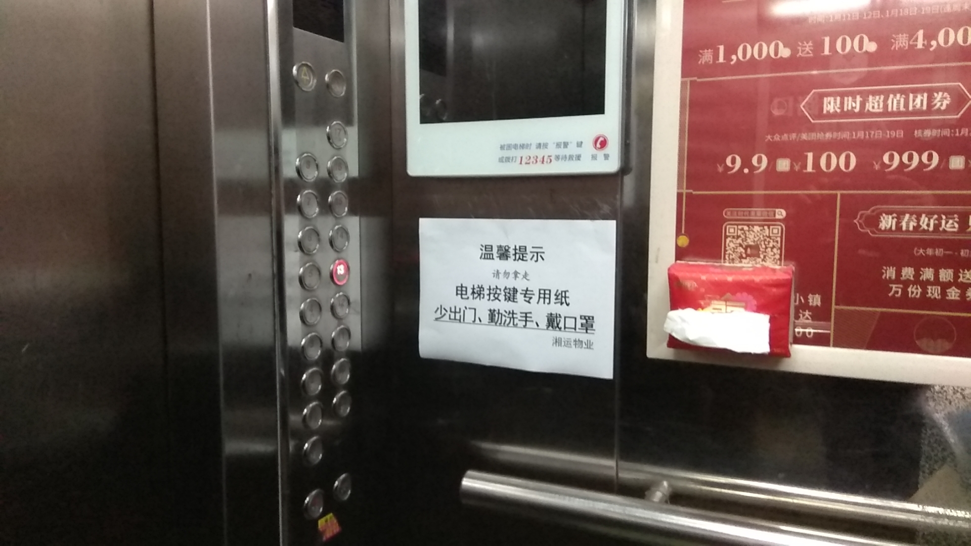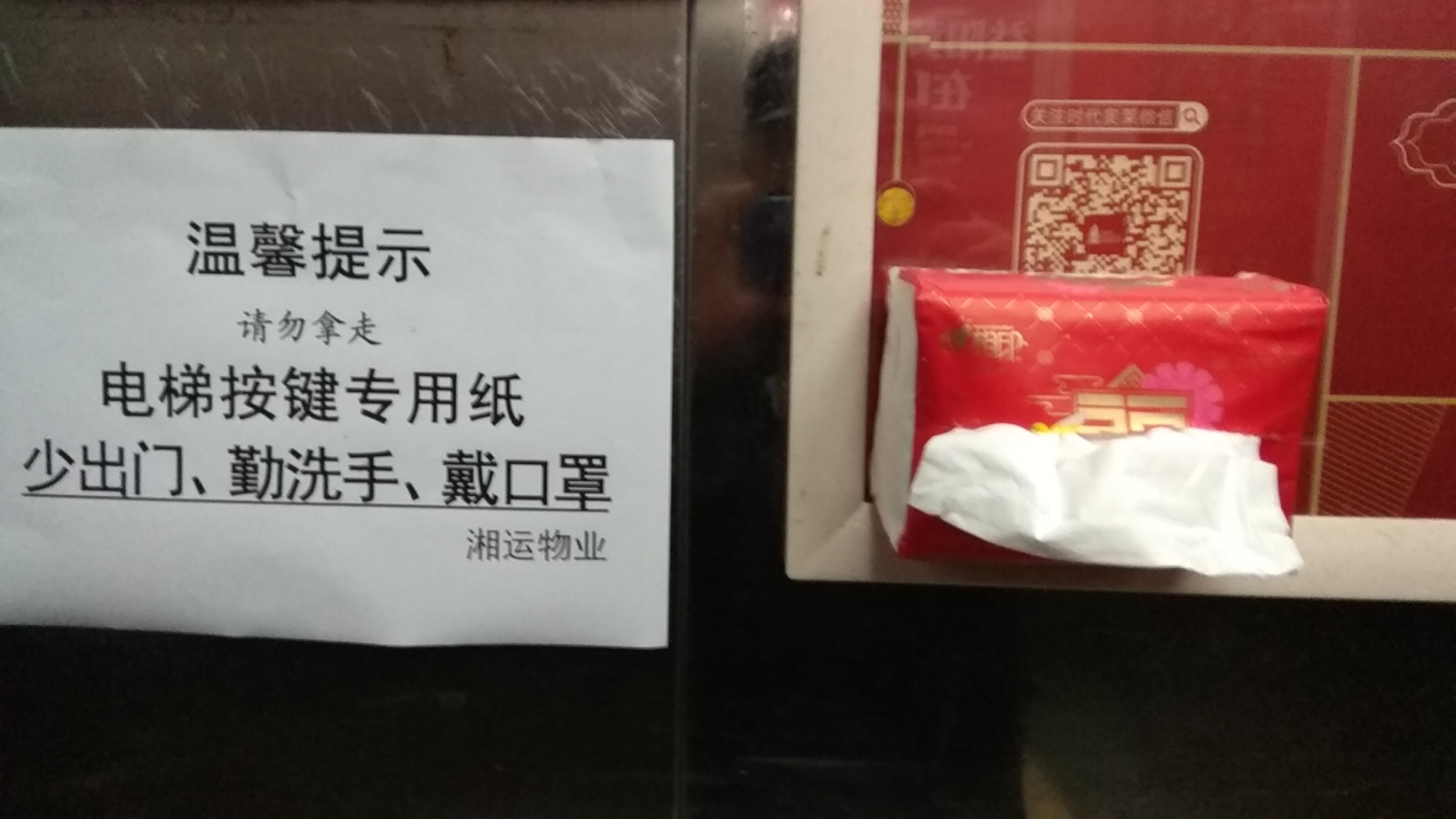 2月1日,在益陽市桃花里小區(qū)的電梯里,出現(xiàn)了一張醒目的“溫馨提示”A4紙,旁邊安放了一盒抽紙巾。這是湘運(yùn)物業(yè)服務(wù)管理公司細(xì)心防控疫情的有力措施。根據(jù)電梯空間小、封閉嚴(yán),一旦有病毒極易被感染的情況,公司經(jīng)理袁笑當(dāng)天一早就安排值班人員采購、準(zhǔn)備好了相關(guān)物資,并第一時間落實(shí)到位。截止當(dāng)天12:00,桃花里小區(qū)21臺電梯里都有了如圖所示的便民抽紙。