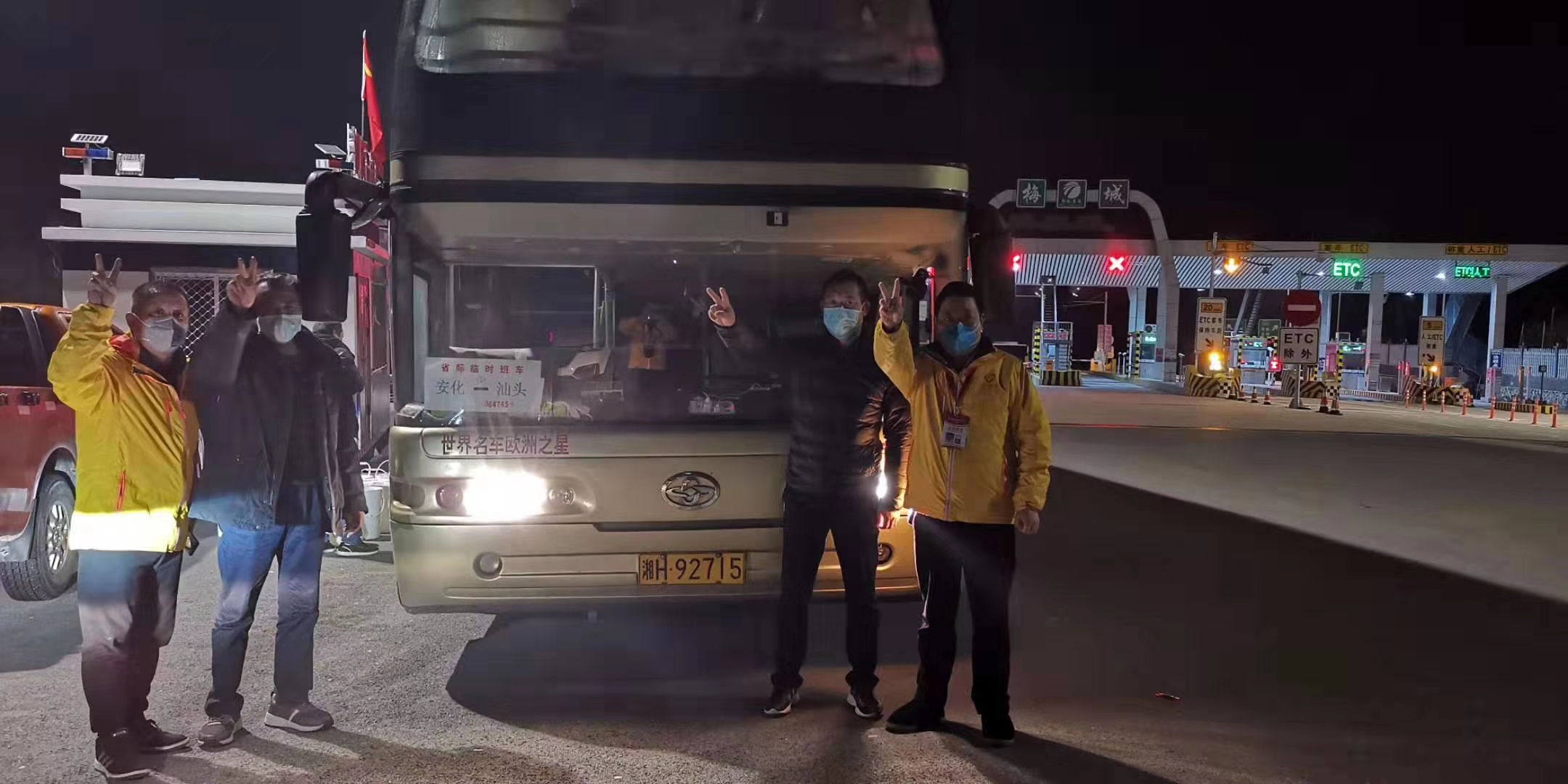 湘H92715是安化運(yùn)輸分公司安化至汕頭的承包車輛。2月12日,身在廣東的班線車隊(duì)隊(duì)長黃勇軍獲悉,因?yàn)榭箵粢咔榘不h梅城鎮(zhèn)醫(yī)院消毒液等物資緊缺,急需一批消毒液;廣東博羅縣有400斤消毒液要送回家鄉(xiāng)梅城鎮(zhèn)正苦尋托運(yùn)途徑。黃勇軍立即和車隊(duì)人員商量,決定班車?yán)@道500公里,送貨到高速公路梅城收費(fèi)站。于是,車隊(duì)積極與捐贈(zèng)消毒液的愛心老板取得了聯(lián)系,將400斤消毒液放上了回程的班車。12日早上8點(diǎn),班車從汕頭出發(fā),一路順風(fēng),于13日6點(diǎn)左右抵達(dá)梅城收費(fèi)站。湘H92715將消毒液交給了提前聯(lián)系好、在收費(fèi)站等候的梅城鎮(zhèn)志愿者們。當(dāng)志愿工作人員提出給付運(yùn)費(fèi)時(shí),黃勇軍等車隊(duì)人員異口同聲:不要!醫(yī)院抗擊疫情這么辛苦,這點(diǎn)小忙應(yīng)該幫的!