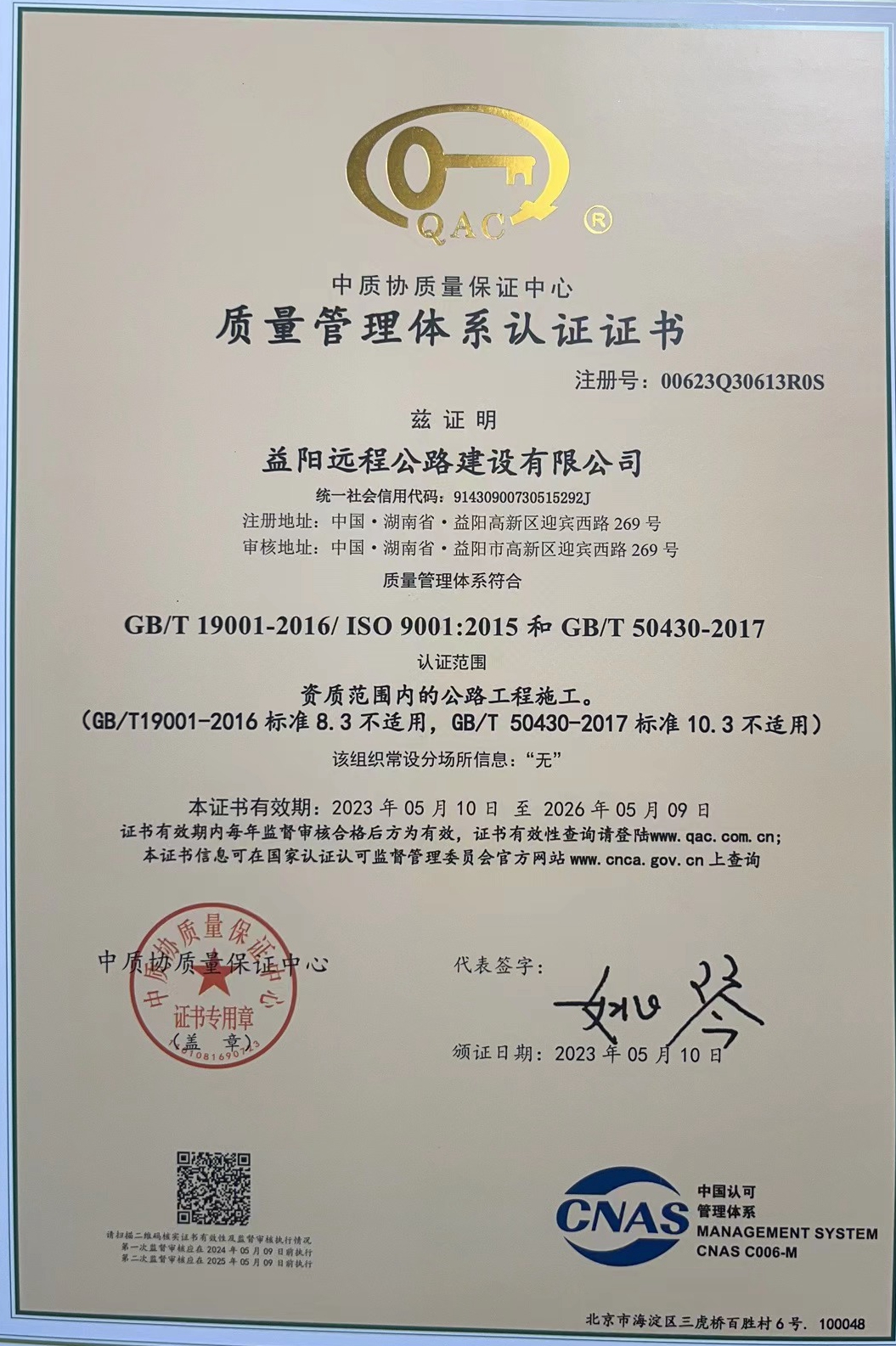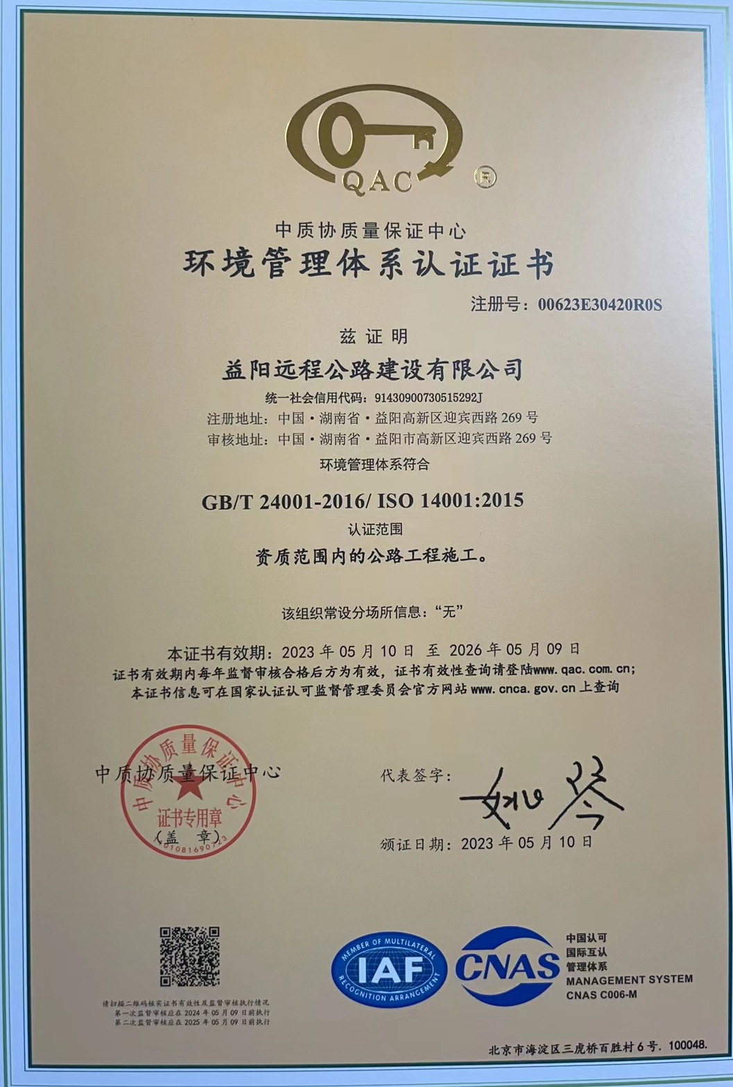 5月10日,中質(zhì)協(xié)質(zhì)量保證中心授予益陽遠(yuǎn)程公路建設(shè)有限公司質(zhì)量管理體系、職業(yè)健康安全管理體系和環(huán)境管理體系認(rèn)證證書。(盛 鶯)